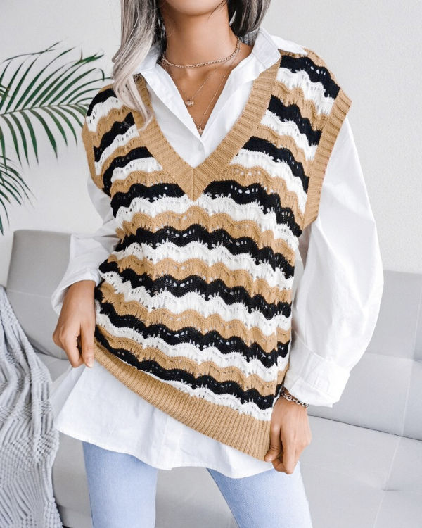 V Neck Knitted Sweater Vest Women Sleeveless Pullover Striped Vintage Fall Waistcoat Sweaters Female Dropshipping