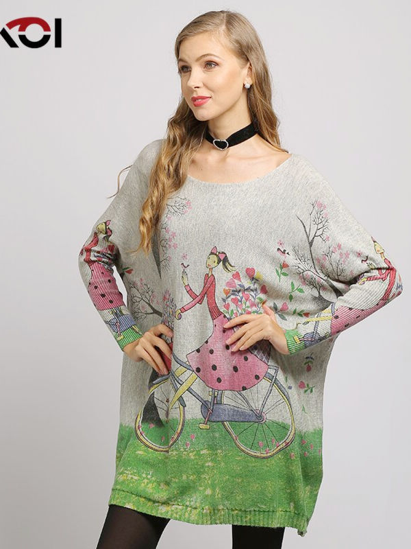 Woman Sweater Long Batwing Sleeve Pullovers O-Neck Knitted Fashion Loose Female Casual Flower Girl Print Clothes