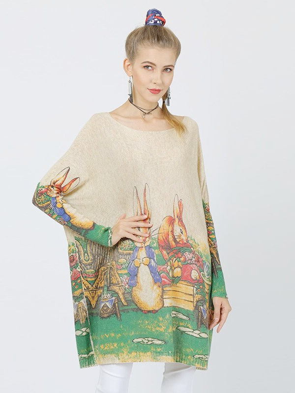 Women Autumn Knitted Sweater Dresses Casual Bunny Print Pullovers Winter Pull Femme Batwing Sleeve Jumper