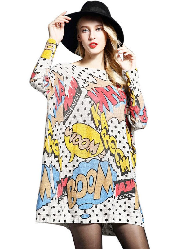Women Autumn Knitted Sweater Dresses Casual Oversize Boom Point Print Pullovers Winter Pull Femme Batwing Sleeve Jumper