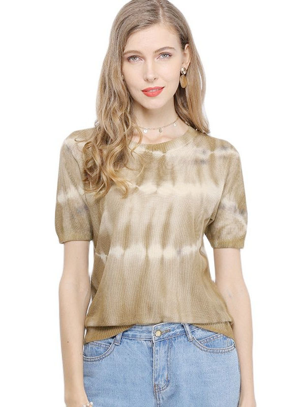 Women Striped Short Sleeve Khaki Oversized Sweaters Shirts O-Neck Cropped Summer Sweater Pullover For Female