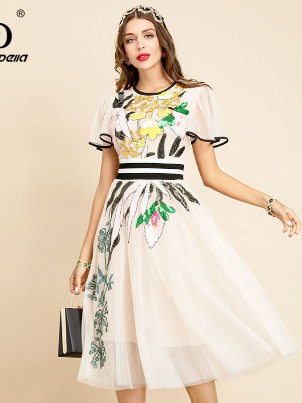 Women Summer Fashion Runway midi Dress Butterfly Sleeve Sequined Embroidery Ladies Slim A-Line Dresses