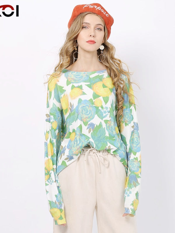 Women Sweater Top Floral Print Sweater For Women Winter Pullover Autumn O-Neck Jumper Knitted Pull Femme