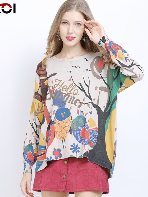 Wool Sweater For Women Winter Warm Pullover Fashion Birds Print O-Neck Oversized Jumper Casual Knitted Sweaters Pull Femme