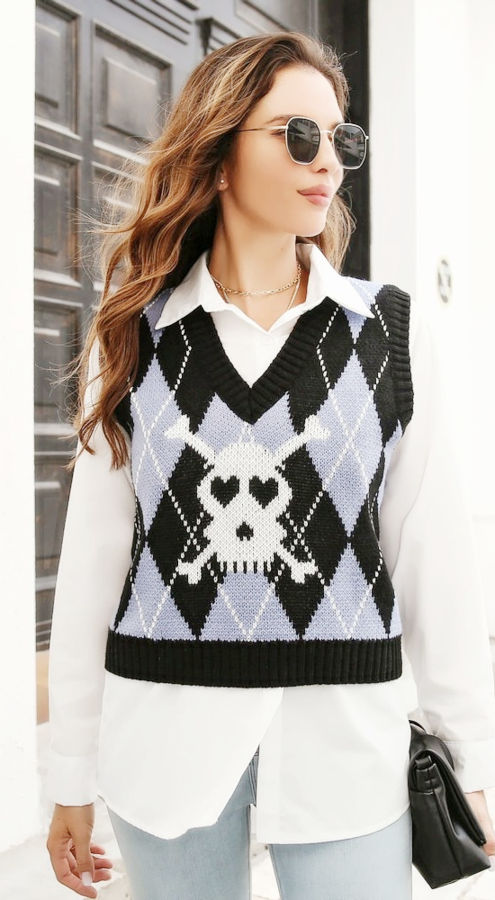 Y2k Halloween Skull Jacquard Sleeveless Knit Vest Sweater Women Streetwear Black Blue Lozenge Ins Style V-Neck Pullovers Gilet